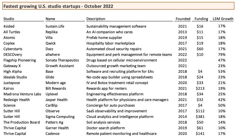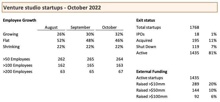 Headcount growth across all studio startups was +1% in October, similar to September and August