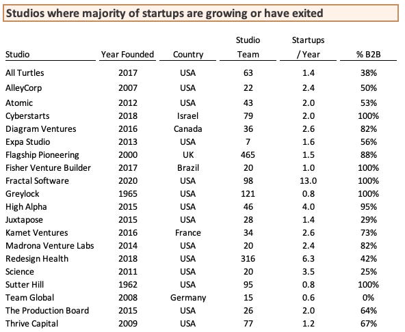 At least 20 studios demonstrated a high “hitrate,” with >50% of their startups either growing or having exited. These studios span multiple strategies, geographies and end markets